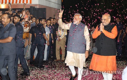 A handout photo made available by the Bharatiya Janata Party (BJP) showing (BJP) leader and Indian Prime Minister Narendra Modi (L) gestures a victory sign and Bharatiya Janata Party (BJP) President, Amit Shah at the party headquarters in New Delhi, India, 23 May 2019. (issued 24 May 2019) The Lok Sabha, the lower house of Parliament, elections, which began on 11 April 2019, is having the results tallied on 23 May. The Lok Sabha elections were held for 542 of the 543 lower house seats, and a party or alliance needs 272 seats to form a government. According to the polling Narendra Modi could retain the position of Prime Minister along with the Bhartya Janta Party (BJP). EPA/BHARATIYA JANATA PARTY HANDOUT HANDOUT EDITORIAL USE ONLY/NO SALES