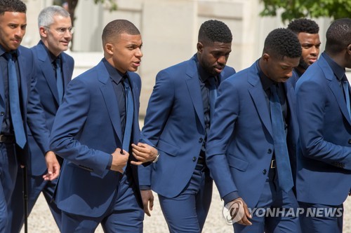 France's national soccer team player Kylian Mbappe (2-L) and teammates arrive for a reception at the Elysee Palace, Paris, France, 04 June 2019. French national soccer team players will be presented with the 'Chevalier de la Legion d'Honneur' medal, (National Order of the Legion of Honour) after winning their second World Cup on July 15 2018 in Russia. EPA/CHRISTOPHE PETIT TESSON